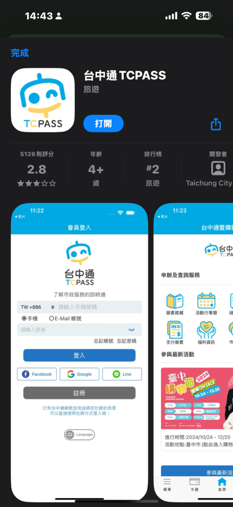 在手機中至 Google Play 商店或 Apple App Store,搜尋「台中通」並下載。
