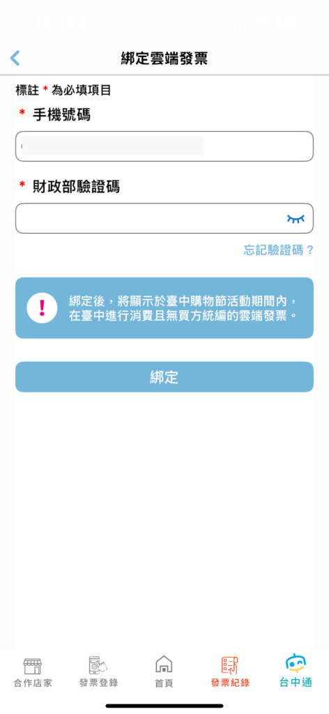完成會員註冊後,先登入你的帳號密碼,若你有申請過財政部的發票載具,建議到「發票紀錄」把雲端發票綁定好,輸入財政部註冊的手機號碼、驗證密碼即完成綁定。