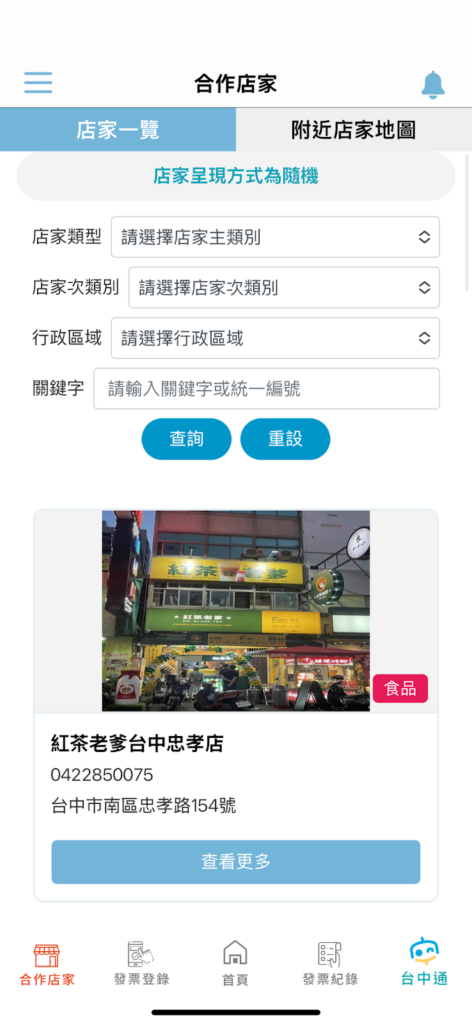要怎麼確認參與購物節的店家有哪些?在台中通的 App 中,就有一欄「合作店家」,可依據店家類型查詢,或開啟訂位功能,即可在地圖上看到附近的合作商家。