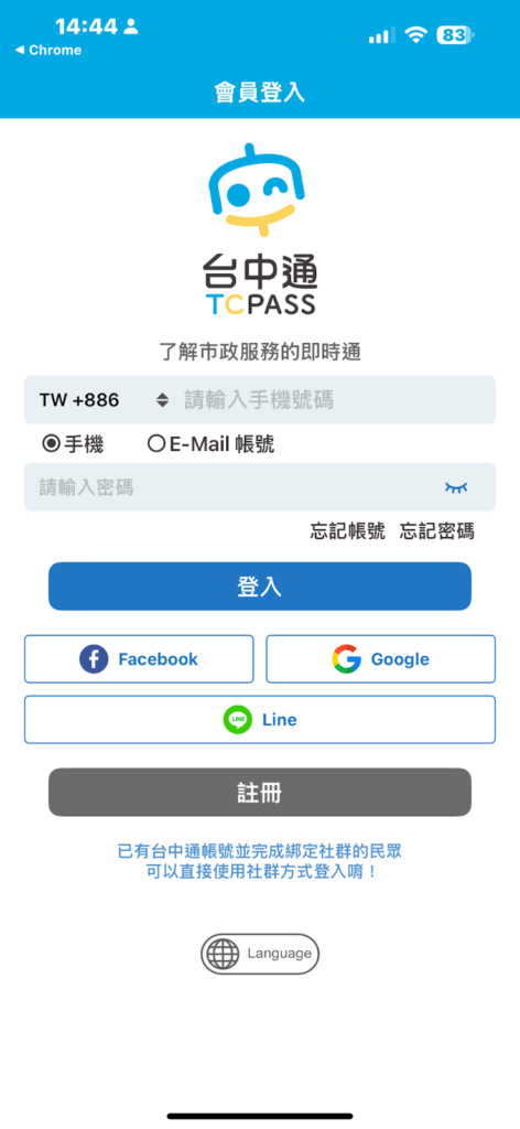 - 輸入帳號、密碼後登入台中通TCPASS APP。
