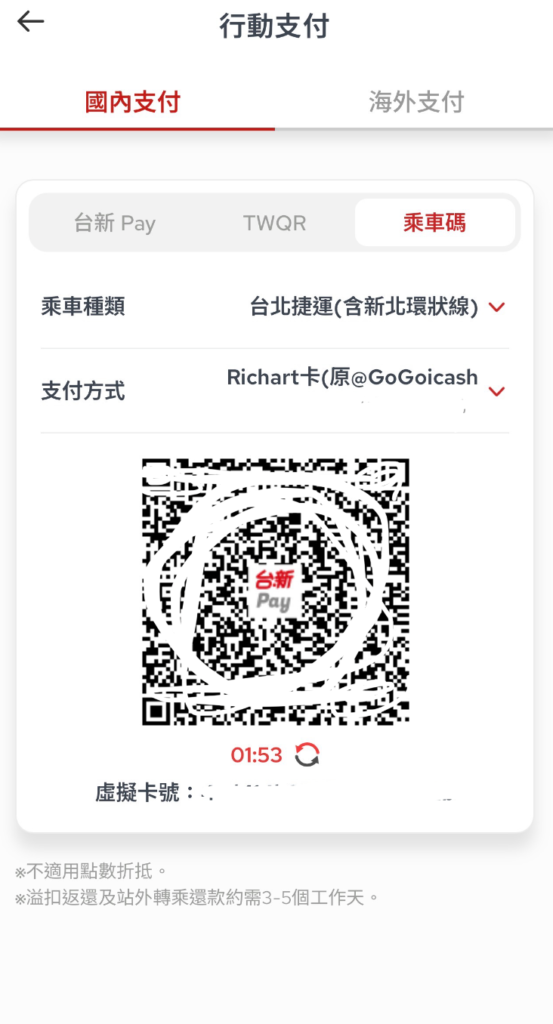 使用前有幾個重要注意事項。首先,你必須先在台新 Pay 中綁定台新銀行的帳戶或信用卡,才能開啟乘車碼功能,進站和出站必須使用同一個支付工具,否則會無法正常出站。如果進站前帳戶餘額低於 50 元或信用卡額度不夠將無法進站。