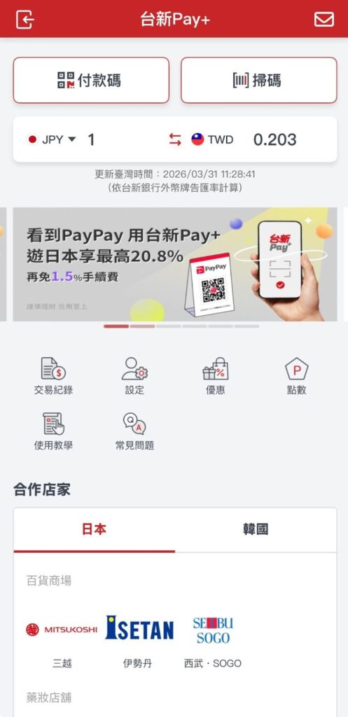台新 Pay+ 可在日本 PayPay 通路以及韓國 Hana pay 合作通路跨境支付。PayPay 是日本最大的行動支付平台之一,涵蓋便利商店、藥妝店、餐廳、百貨公司、觀光景點等。常見的使用場景包括 Bic Camera、松本清、各大超市與餐飲連鎖等,基本上在日本看到 PayPay 標誌的地方都可以用。