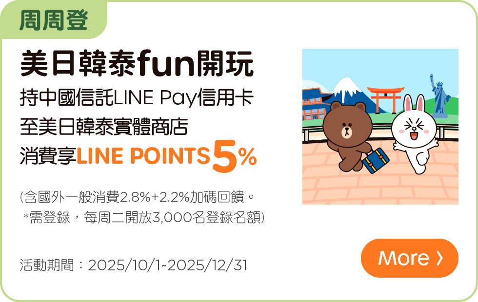 - 完成登錄後,持中國信託LINE Pay信用卡於美國、日本、韓國、泰國實體店面消費,享最高LINE POINTS 5%回饋(含原國外實體商店消費2.8%回饋)。