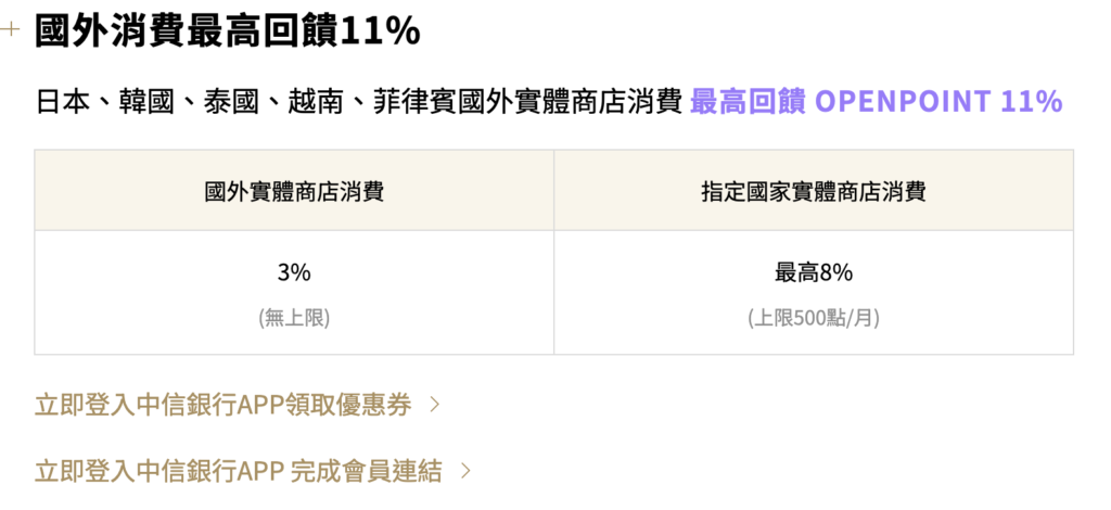 最高 11% | 500 點 | 海外一般消費 3% 回饋無上限,指定國家加碼 8%。回饋 OPENPOINT 點數 |