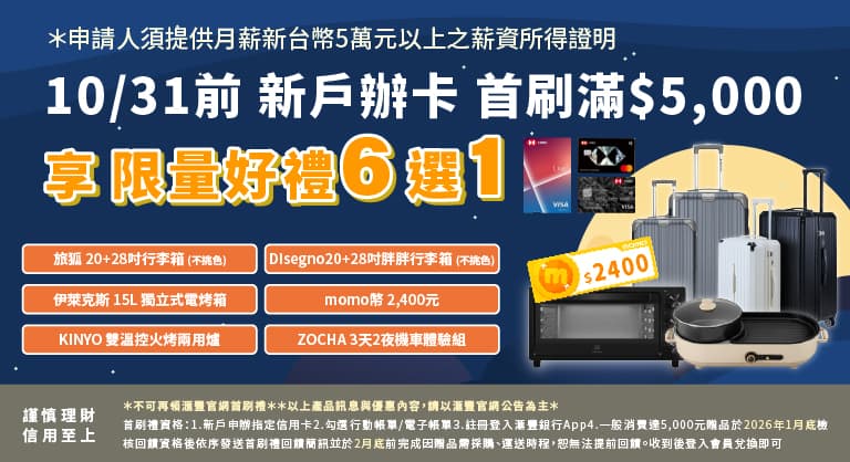2025/10/31前,透過安錢感連結申辦滙豐現金回饋御璽卡,並達成指定首刷條件,享旅狐20+28吋行李箱/Disegno20+28吋胖胖行李箱/伊萊克斯電烤箱/KINYO火烤兩用爐/ZOCHA 3 天 2 夜機車旅遊體驗組合/momo幣 2,400元,好禮六選一。詳細資訊,繼續往下看!