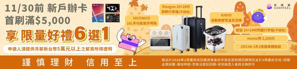 - 活動期間:即日起至 2025/11/30 線上申請,並於申請日期後45天內完成核卡