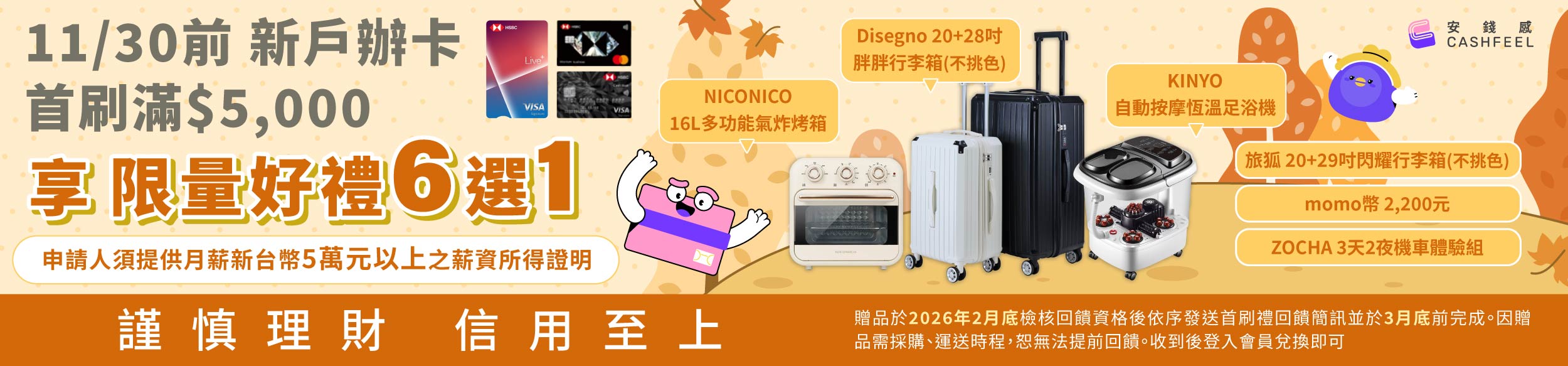 2025/11/30前,透過安錢感連結申辦滙豐現金回饋御璽卡,並達成指定首刷條件,享旅狐20+29吋行李箱/Disegno 20+28吋胖胖行李箱/KINYO自動按摩恆溫足浴機/NICONICO 16L多功能氣炸烤箱/ZOCHA 3 天 2 夜機車旅遊體驗組合/momo幣 2,200元,好禮六選一!詳細資訊,繼續往下看!