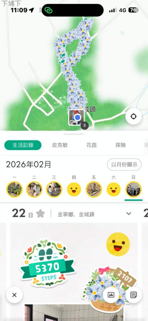 在每天晚上 9 點左右,遊戲會幫你結算今天的總步數、走過的路線圖以及今天種下多少朵花,你可以選擇一張手機相簿裡的照片放在日誌上。