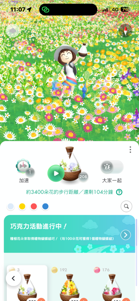 在主畫面右下方的花朵圖示,點下開始後邊走邊種花,不僅會在個人的地圖上留下花朵軌跡,還會加速皮克敏孵化速度,並且獲得金幣!