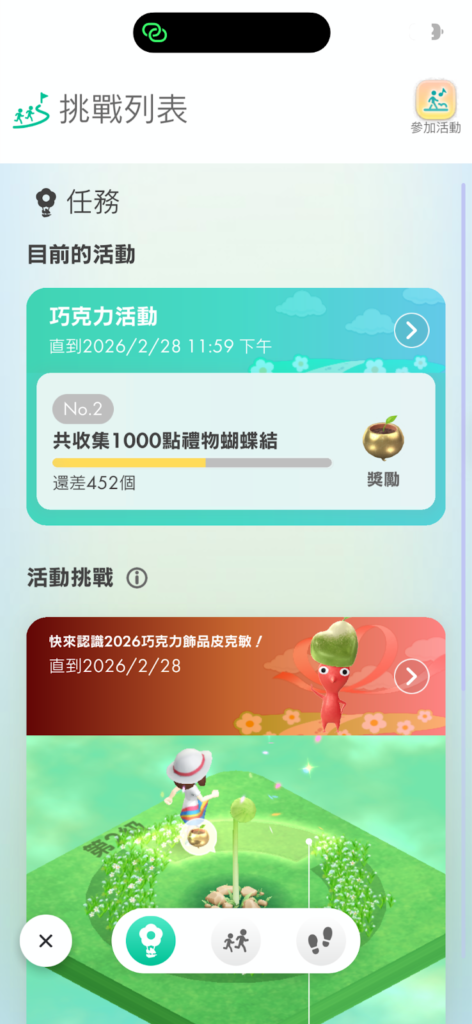 挑戰是期間限定的任務,每個挑戰共有四個階段,完成後中間會完成綻放巨大花朵,就能獲得金色花苗以及獲得隨機的禮物;社群日是每個月會舉辦一次、通常在週末,只要在指定時間內走滿一萬步,就能獲得當月限定的精華徽章,是玩家們每個月最期待的步行盛會。