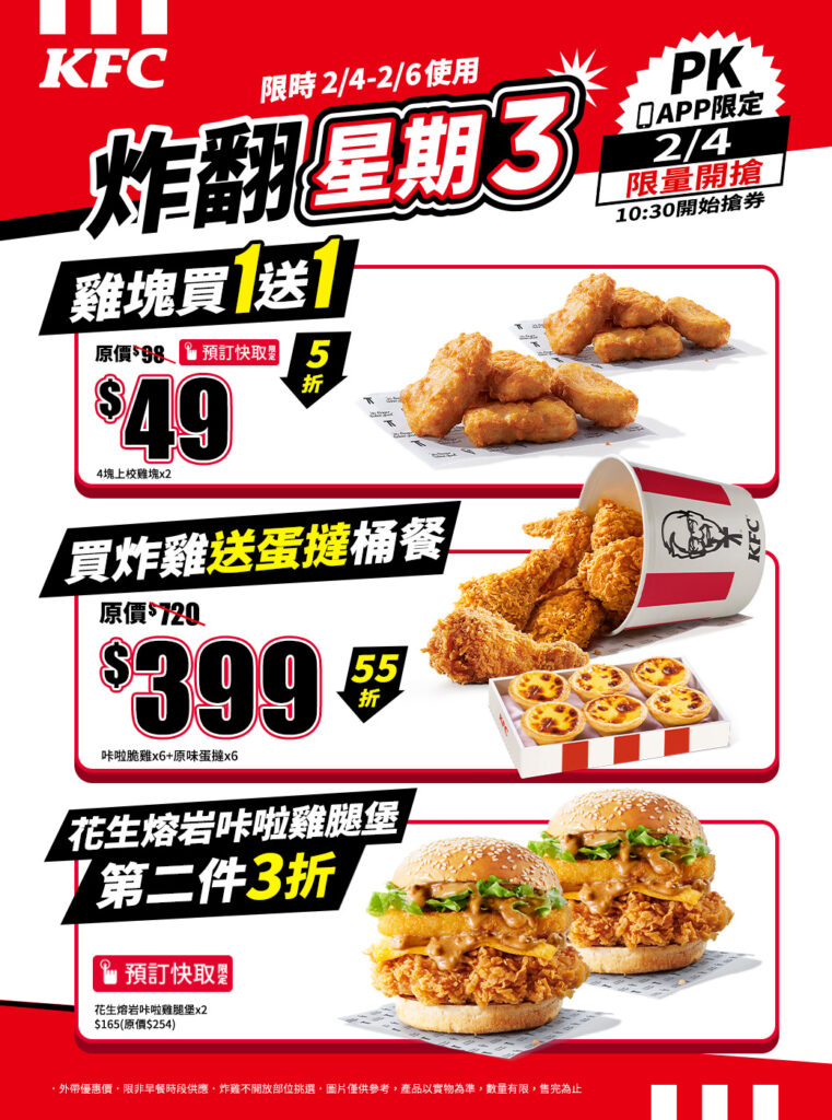 炸翻星期三為 PK APP 的專屬限時優惠,固定在每週三的 10:30 開放領券,經常出現買一送一、6 折以下的超級優惠,優惠券有限領完為止。使用時間固定為每週三、四、五。編輯曾經搶過優惠券,並不會立即秒殺,到中午再領券還綽綽有餘。