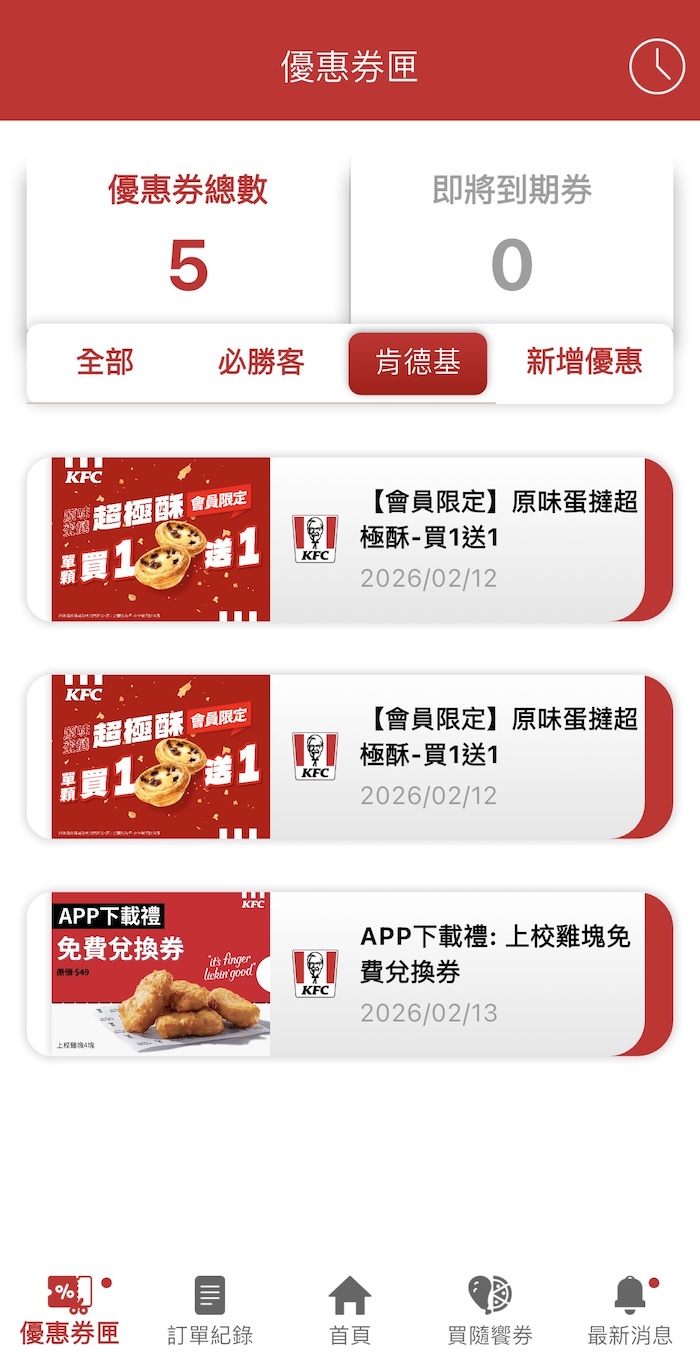 | 6/30 | 15931 | 5塊雞桶+1盒原味蛋撻(6入)+1杯冰無糖綠茶(小)=NT$398 | ![]() |