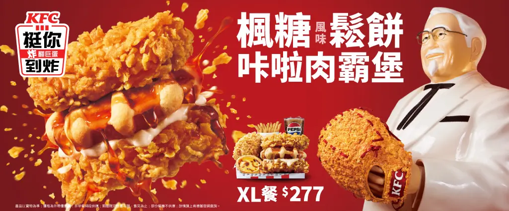 | XL全明星餐 | $277 | 楓糖鬆餅咔啦肉霸堡*1+咔啦脆雞*1+香酥脆薯(小)*1+原味蛋撻*1+百事可樂(中)*1 |