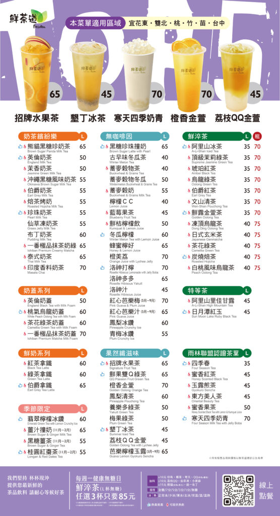 鮮茶道以茶感與生活感並重的產品結構建立品牌辨識度,從現沖原茶的乾淨茶韻、果茶中果香與茶底的平衡,到不厚重卻保留茶感的奶茶與輕乳系列,以及穀麥、米麻糬等療癒系飲品,逐步累積穩定回購客群,在競爭激烈的手搖市場中走出一條屬於自己的定位。
