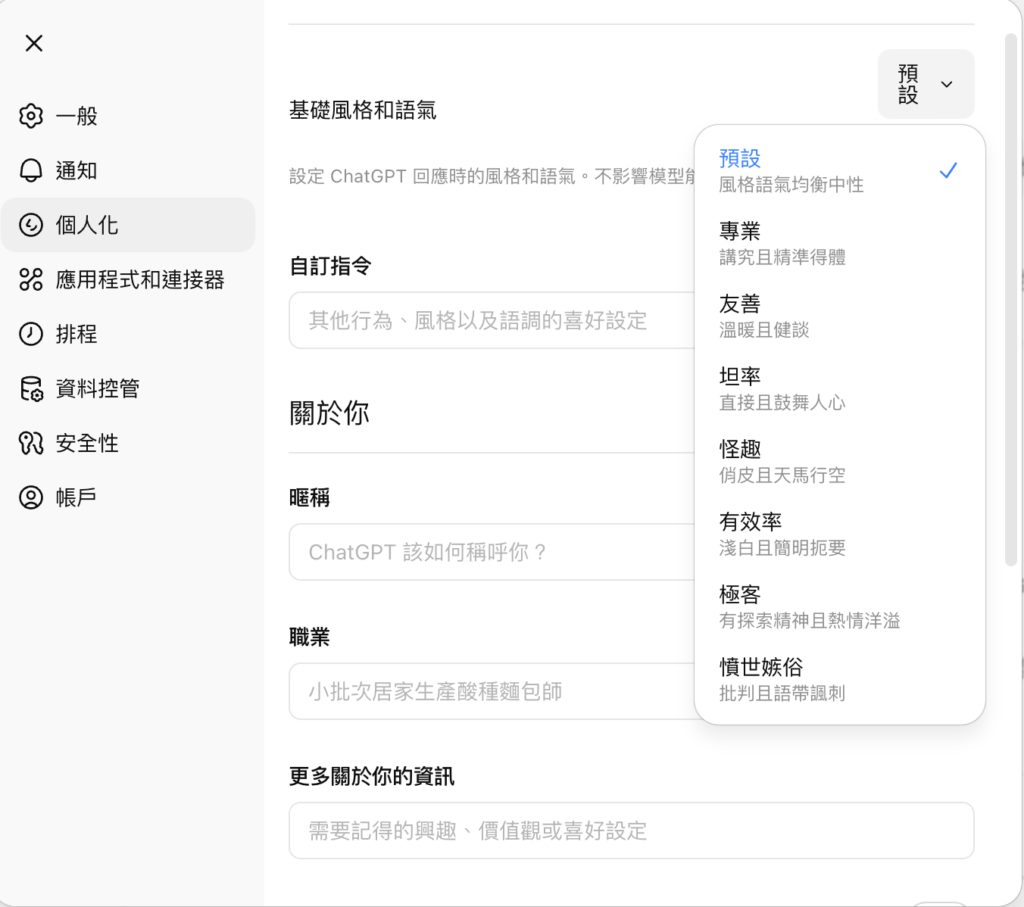 GPT-5.1 最大的亮點,是新增並強化「語氣模式」功能,使用者現在可以在 Default、Professional、Friendly、Candid、Quirky、Efficient、Nerdy、Cynical 八種風格間自由切換,讓聊天機器人不只會回答,更能符合情境與喜好。相比純效能提升,這種「個性化互動」更讓一般用戶明顯感受到差異:像是用 Professional 請它寫提案、用 Friendly 聊天、用 Quirky 創作點子,都會有完全不同的語氣與風格。這讓 GPT-5.1 更像真正能調整表達方式的智慧助理,而不是單純更強的模型。