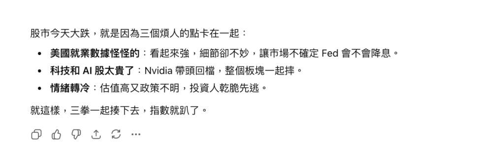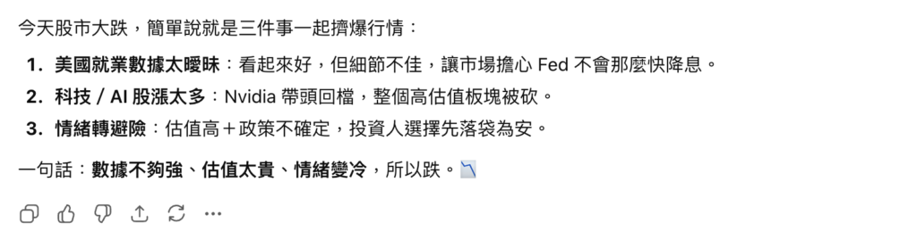編輯實際使用「怪趣」和「憤世嫉俗」的模式,詢問「今日股票大跌原因」,分別得到回答如下。