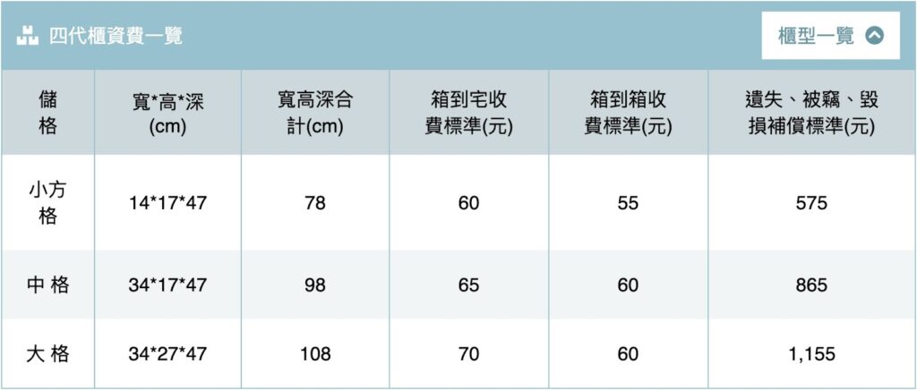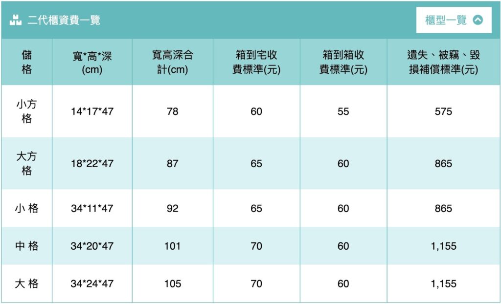 二代櫃儲格包含小方格、大方格、小格、中格與大格。箱到宅費用為 60~70 元,箱到箱費用為 55~60 元。補償金額依儲格大小從 575 元至 1,155 元不等。