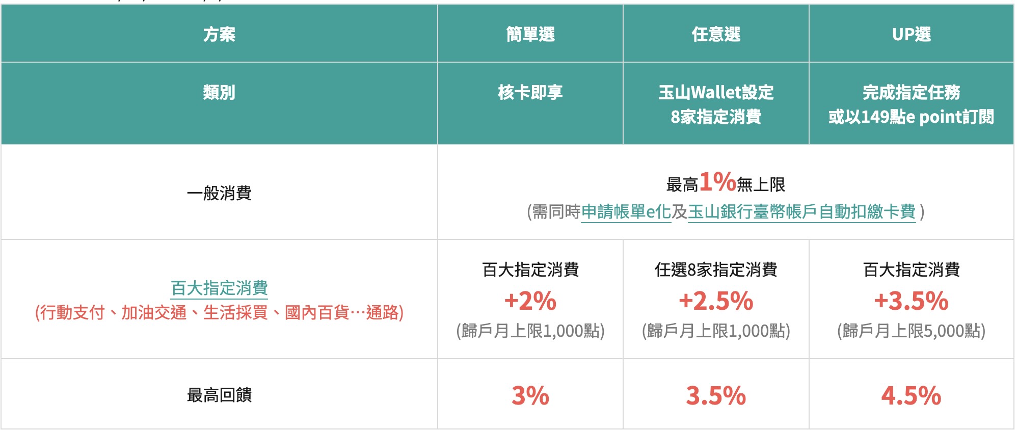 玉山 Unicard 2025 下半年權益有稍微調整,首先取消新戶額外的 0.5% 加碼。其次,各方案回饋上限增加,「簡單選」、「任意選」從每月上限 500 點提高到 1,000 點,「UP選」則從 2,000 點提調至 5,000 點。然而,「UP 選」每月訂閱扣 99 點變成 149 點。