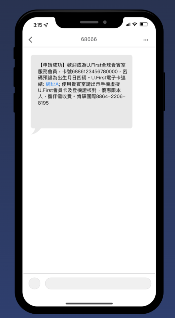 申請成功後,將會收到手機簡訊。簡訊中將會提供卡號、預設密碼及網址。